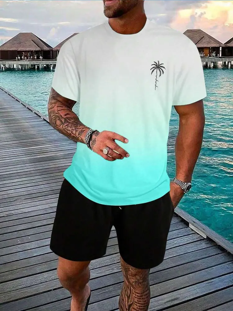 Summer men's two-piece set Hawaii fashion casual men's T-shirt outdoor beach men's shorts palm tree print round neck soft and co